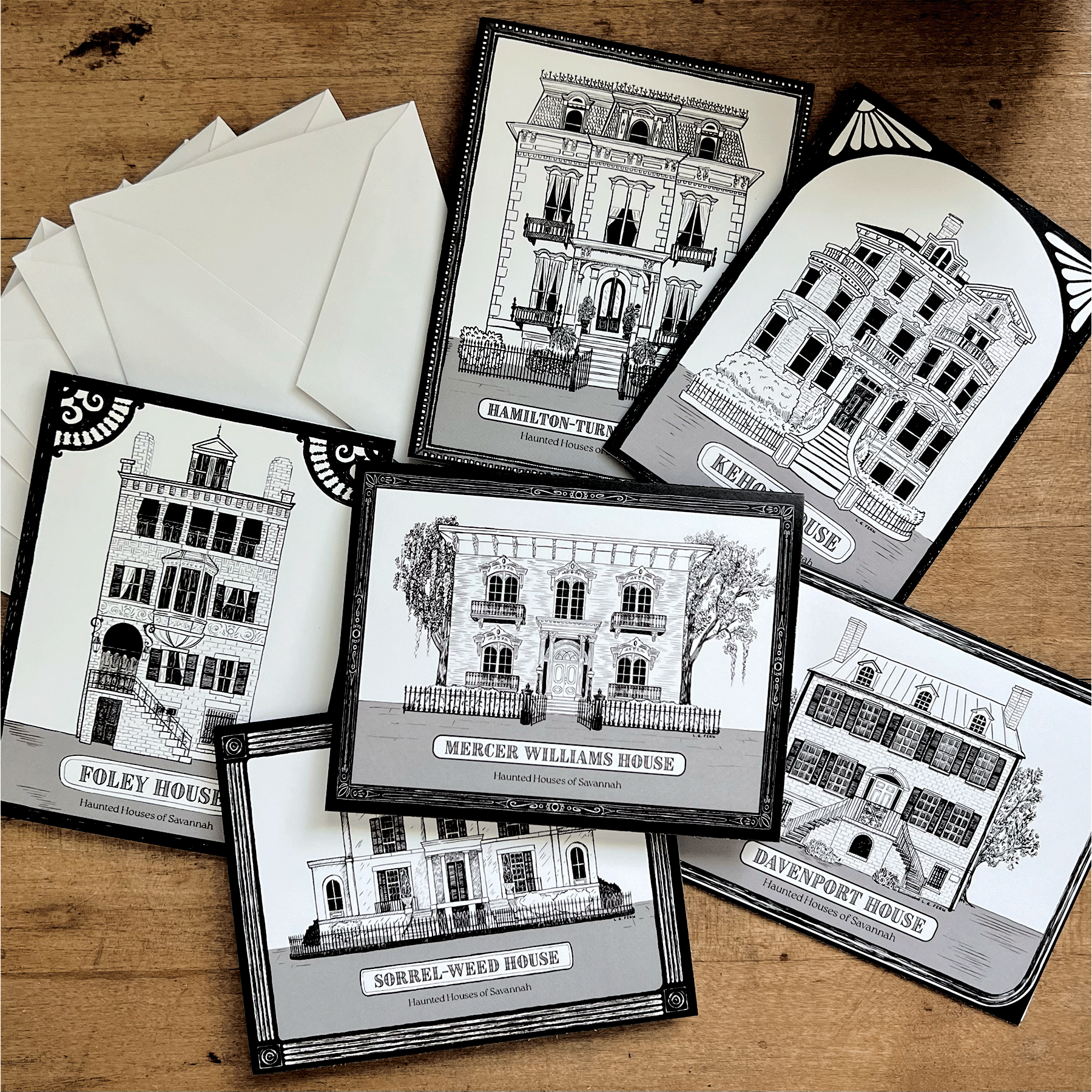 Add a touch of haunted history to your shop with the L. R. Fern Haunted House Series. This greeting card set features an illustrations of six of Savannah's most well-known haunted houses. The Mercer Williams House, Foley Inn, Hamilton-Turner Inn, Sorrel-Weed House, Kehoe House, and the Davenport House are all represented.