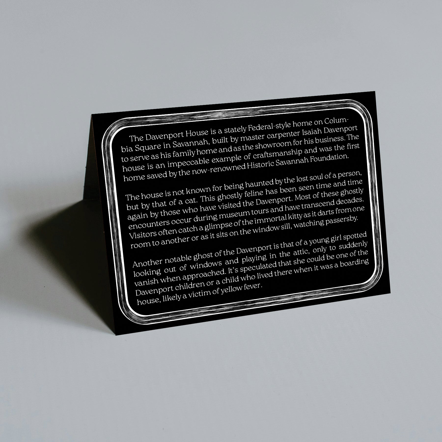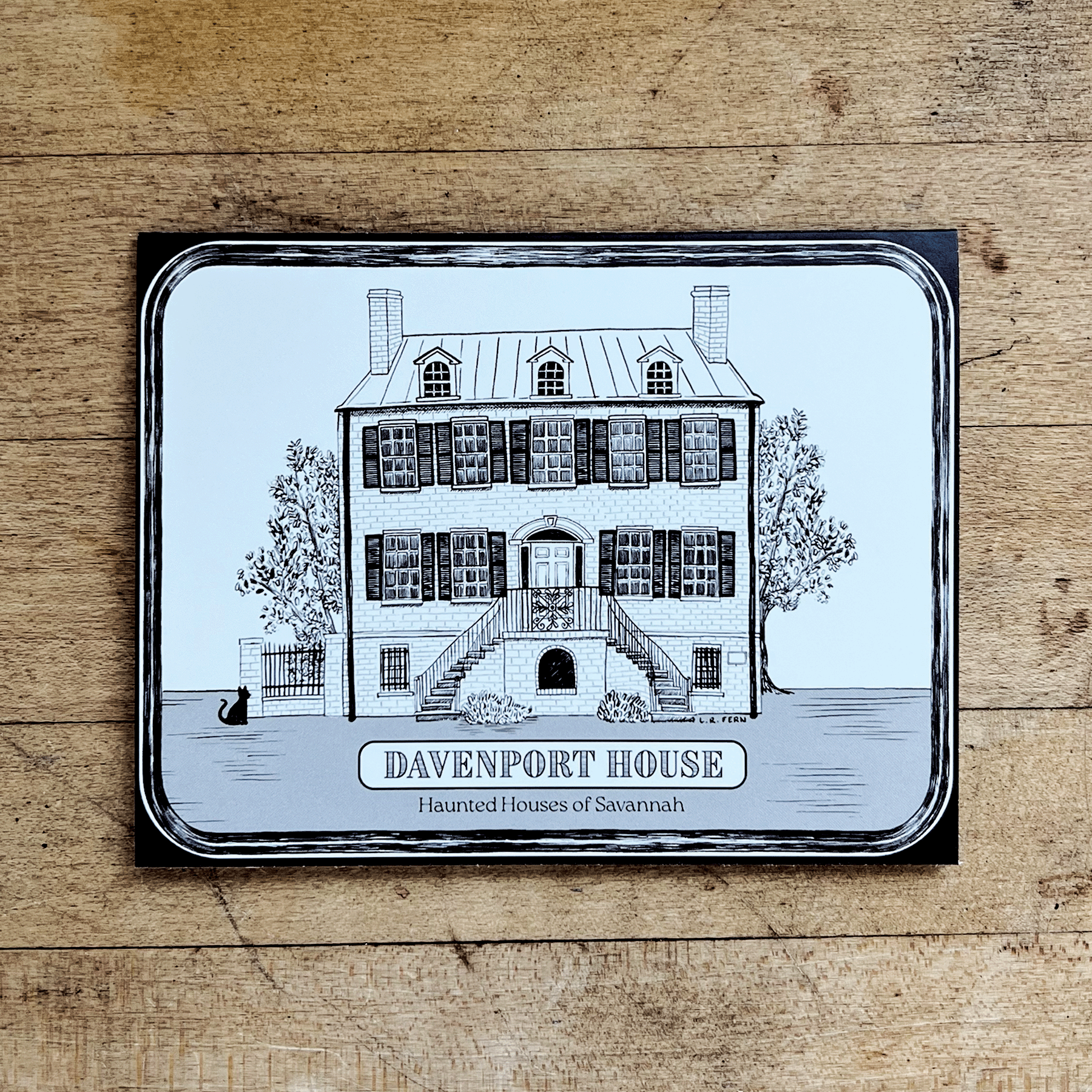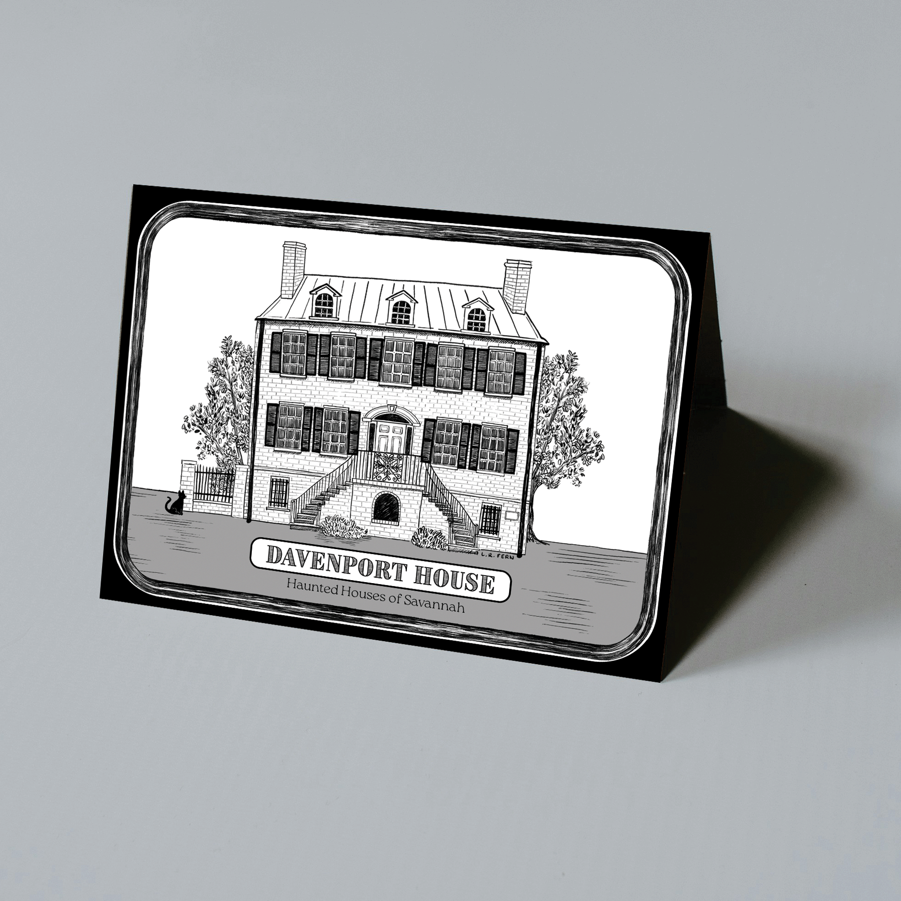 Part of the L. R. Fern Haunted House series, this greeting card features an illustration of the Davenport House on Columbia Square in Savannah, Georgia.