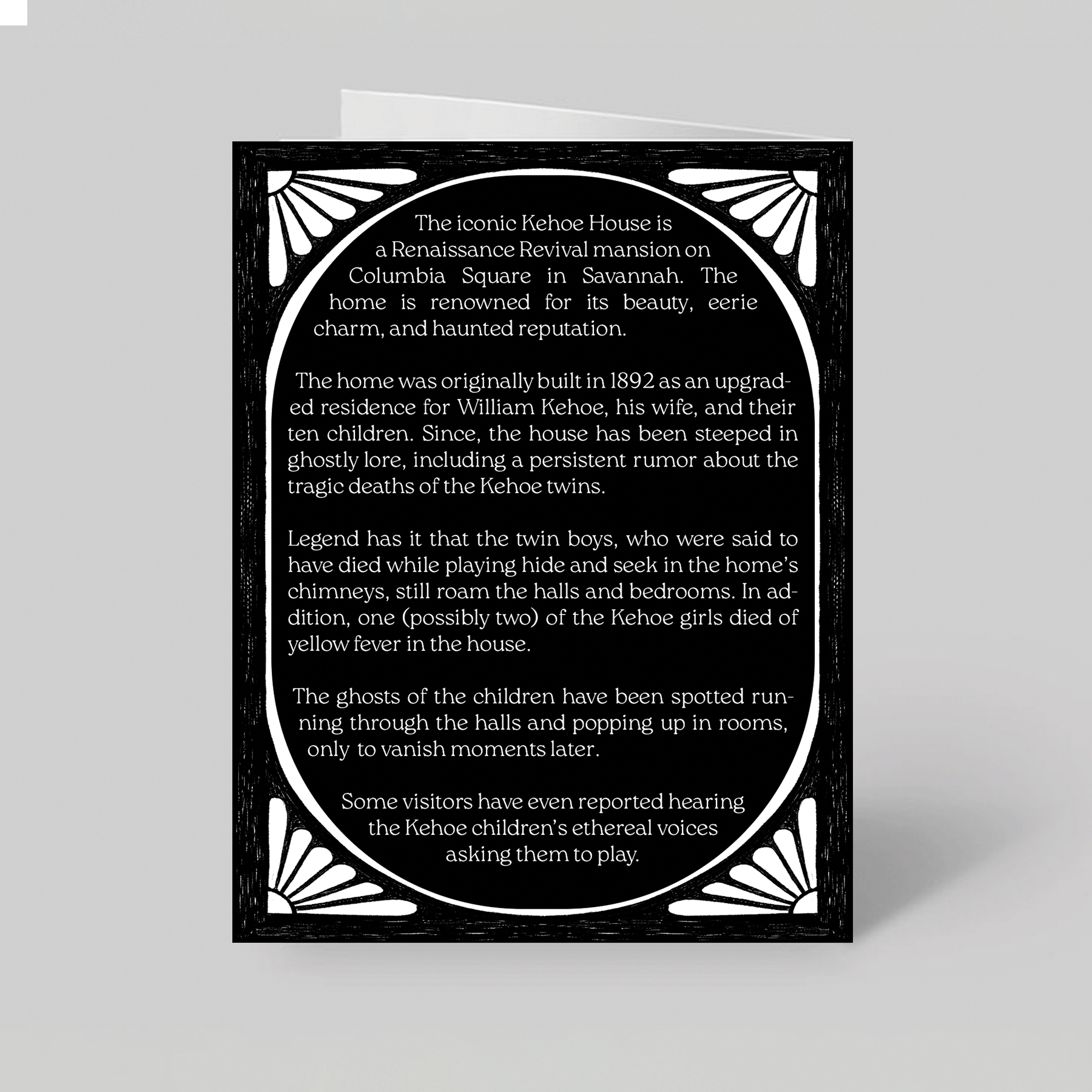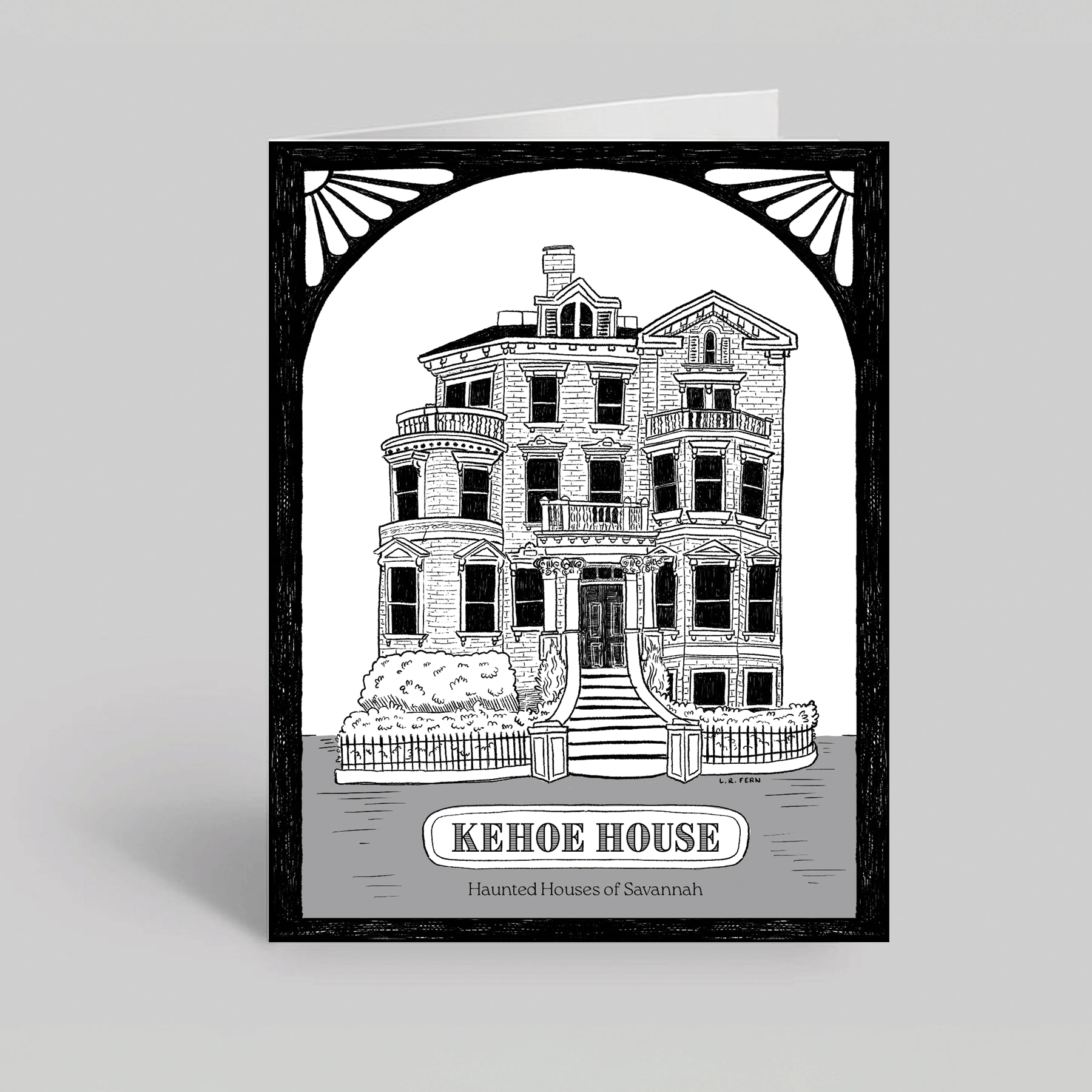 Part of the L. R. Fern Haunted House series, this greeting card features an illustration of the Kehoe House on Columbia Square in Savannah, Georgia.