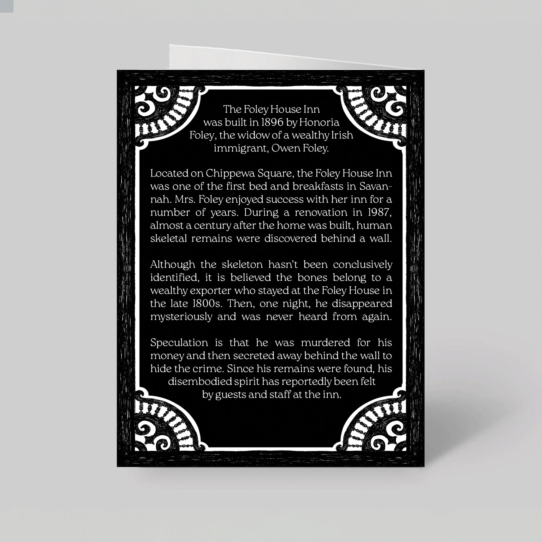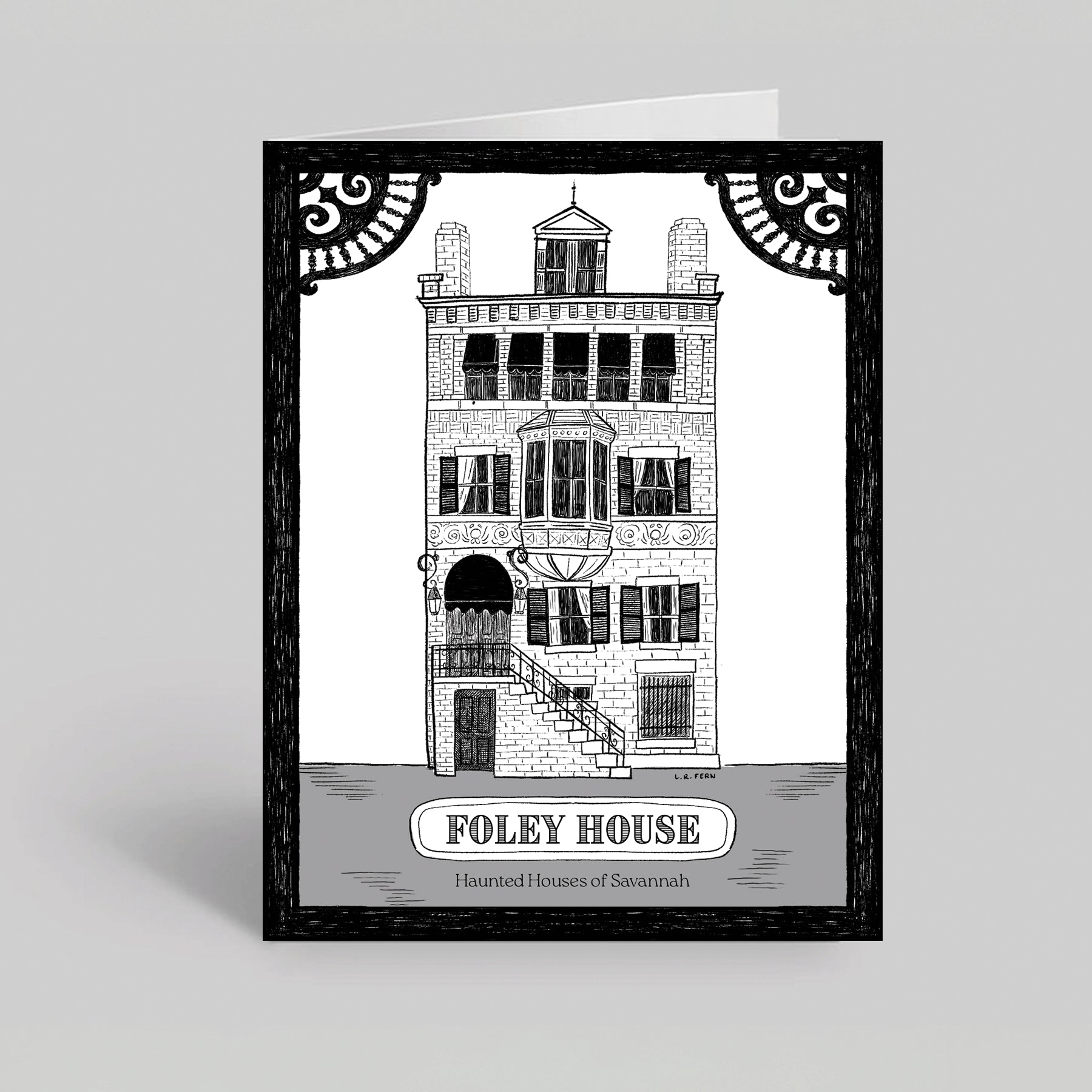 Part of the L. R. Fern Haunted House series, this greeting card features an illustration of the Foley House on Chippewa Square in Savannah, Georgia.